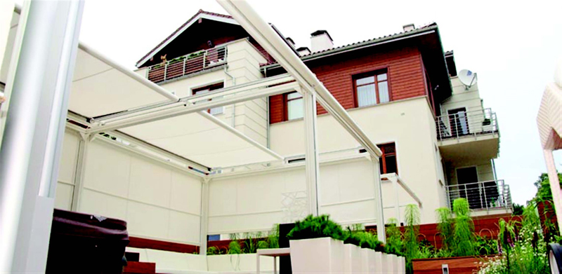 The Veranda FTS with a fabric tensioning system is engineered to cover flat horizontal and inclined surfaces, including conservatories or skylights. Dual engines with integrated load sensors ensure continuous fabric tension, even across expansive areas. This system is suitable for both indoor and outdoor applications.