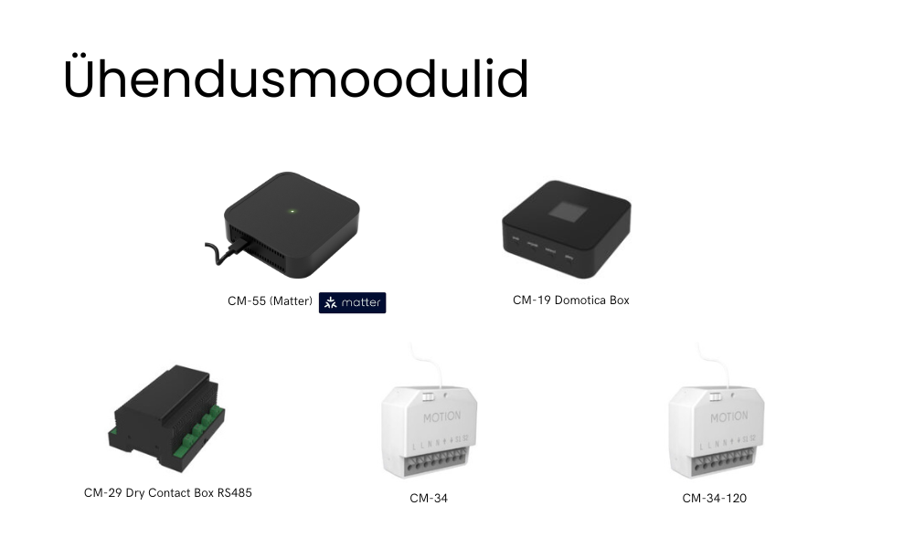 - Hoonehalduse süsteemidega, nagu KNX, Control4, Loxone ja teised.