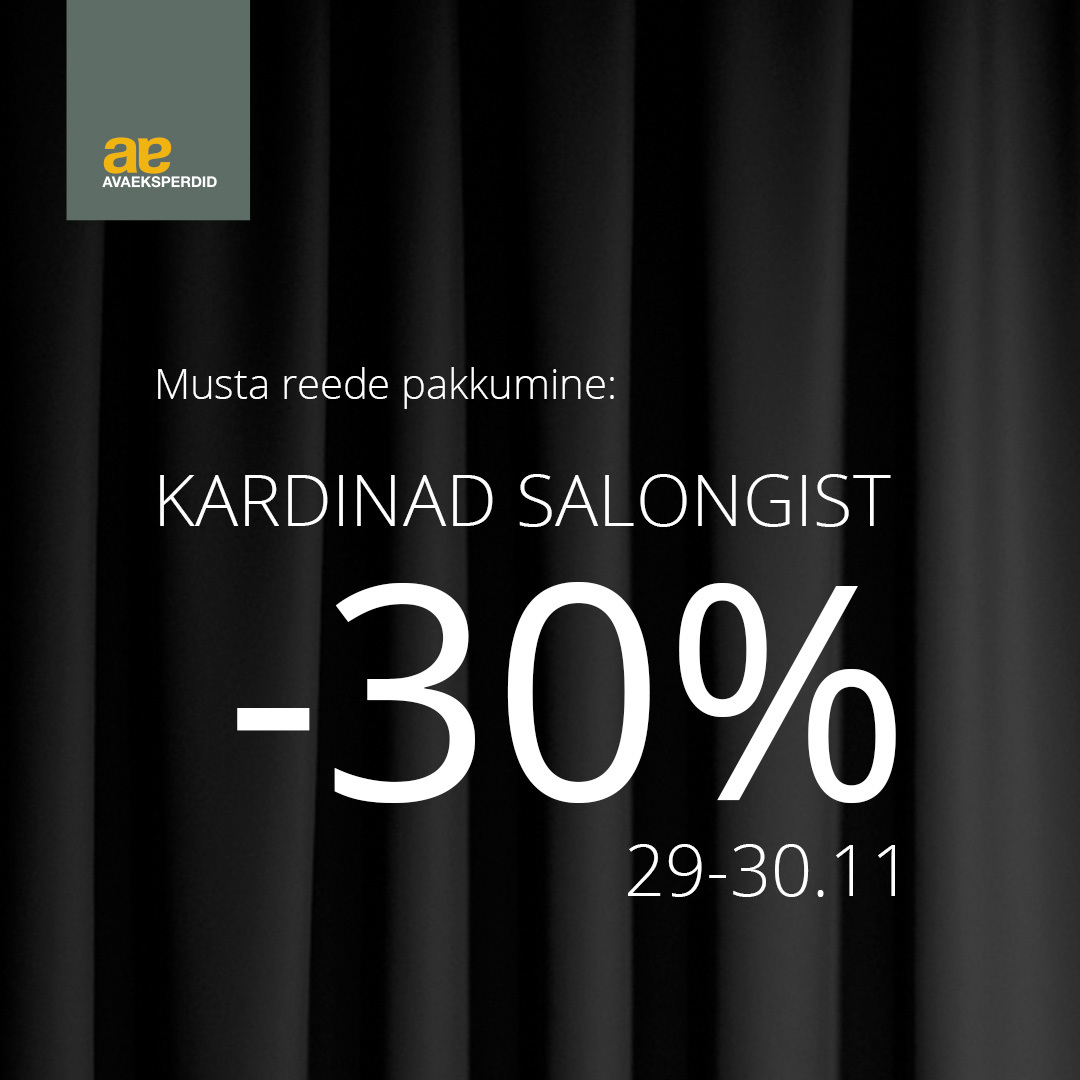 Kasuta võimalust ja lisa kvaliteetsete kardinatega kodule hygge’t või kontorile iseloomu! Peale mõnusa atmosfääri loomise vähendavad õigesti valitud kardinad külmal ajal ka Sinu küttearveid. Seega, tule musta reede nädalavahetusel meie salongi ja telli endale imelised ja samas ka kasulikud kardinad tavapärasest palju soodsamalt!
